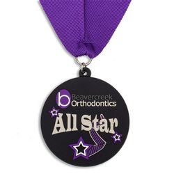 Top off your award presentation by adding an optional custom medal neck ribbon. A colorful idea for charity runs, intramural sports and much more. 3D PVC medallions are also available, quoted upon request.